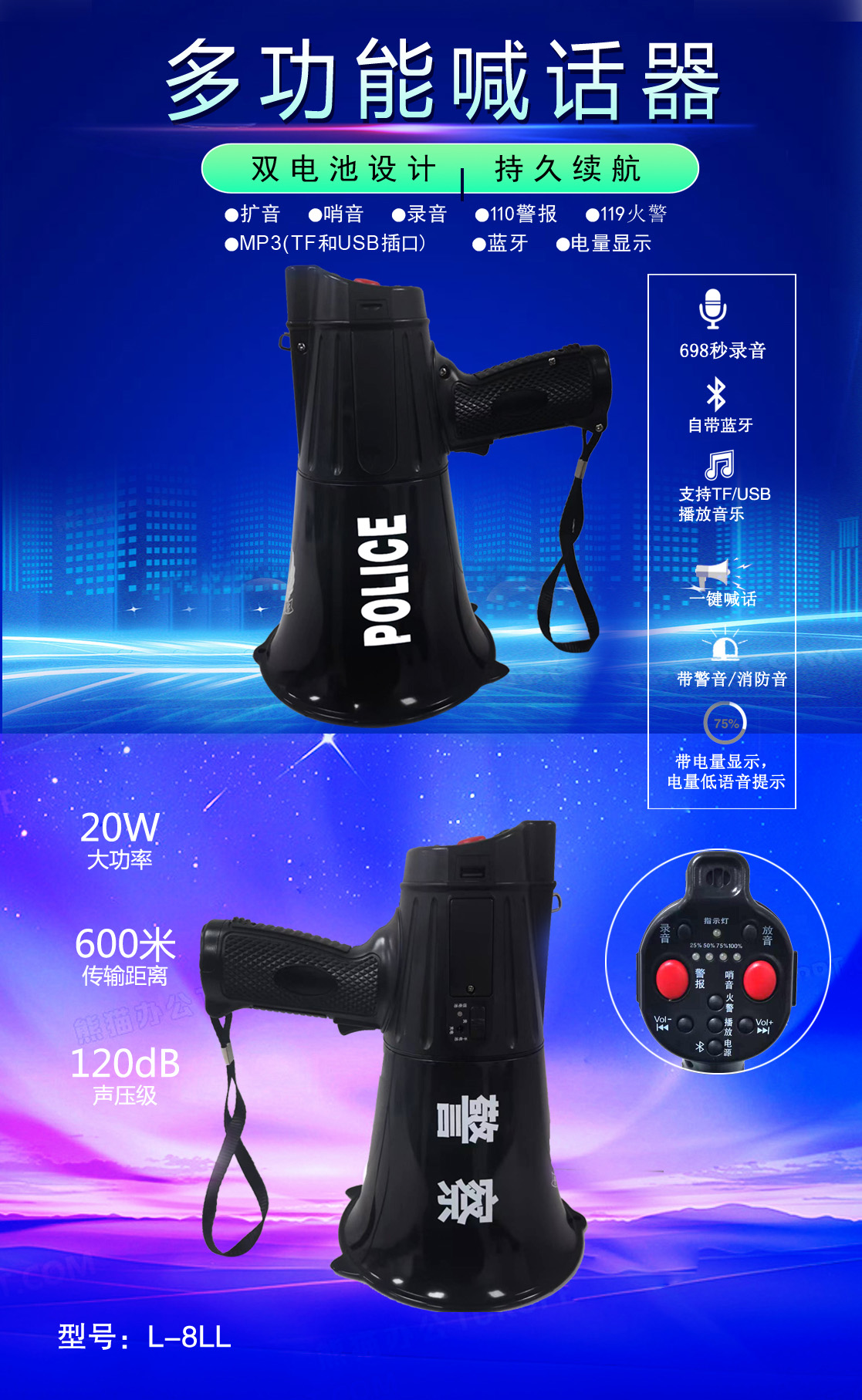 • 專業(yè)設計,外觀獨特、新穎,操作簡便的多功能喊話器