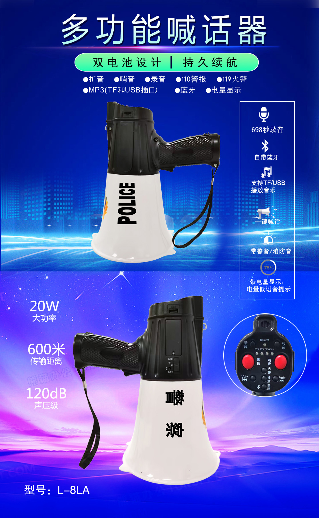 • 專業(yè)設(shè)計(jì),外觀獨(dú)特、新穎,操作簡(jiǎn)便的多功能喊話器