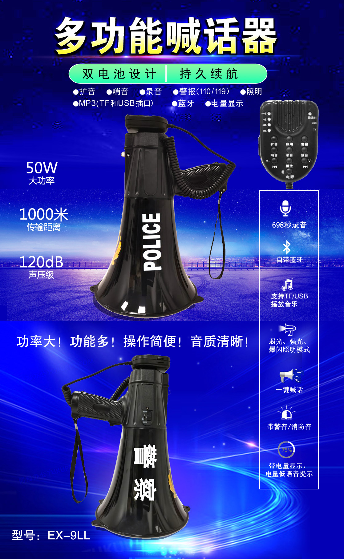 • 專業(yè)設計,外觀獨特、新穎,操作簡便的多功能喊話器