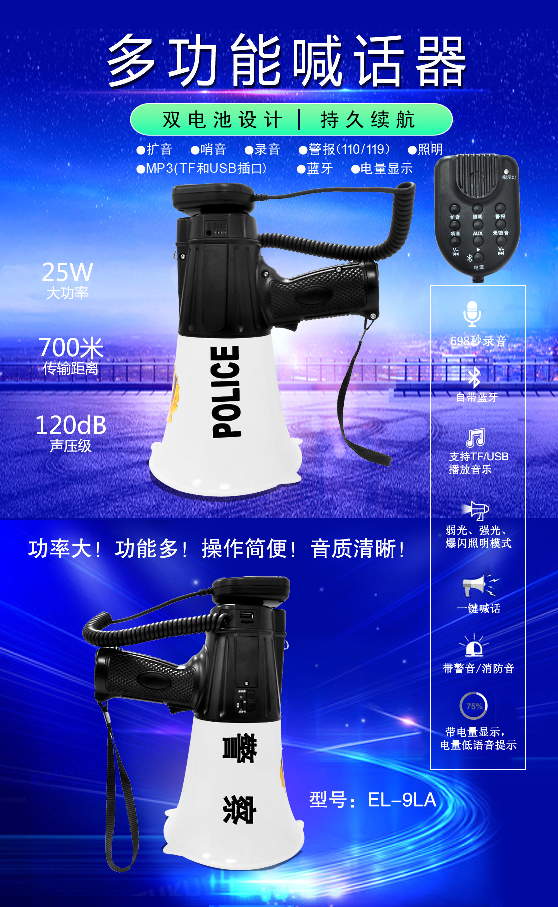 • 專業(yè)設計,外觀獨特、新穎,操作簡便的多功能喊話器