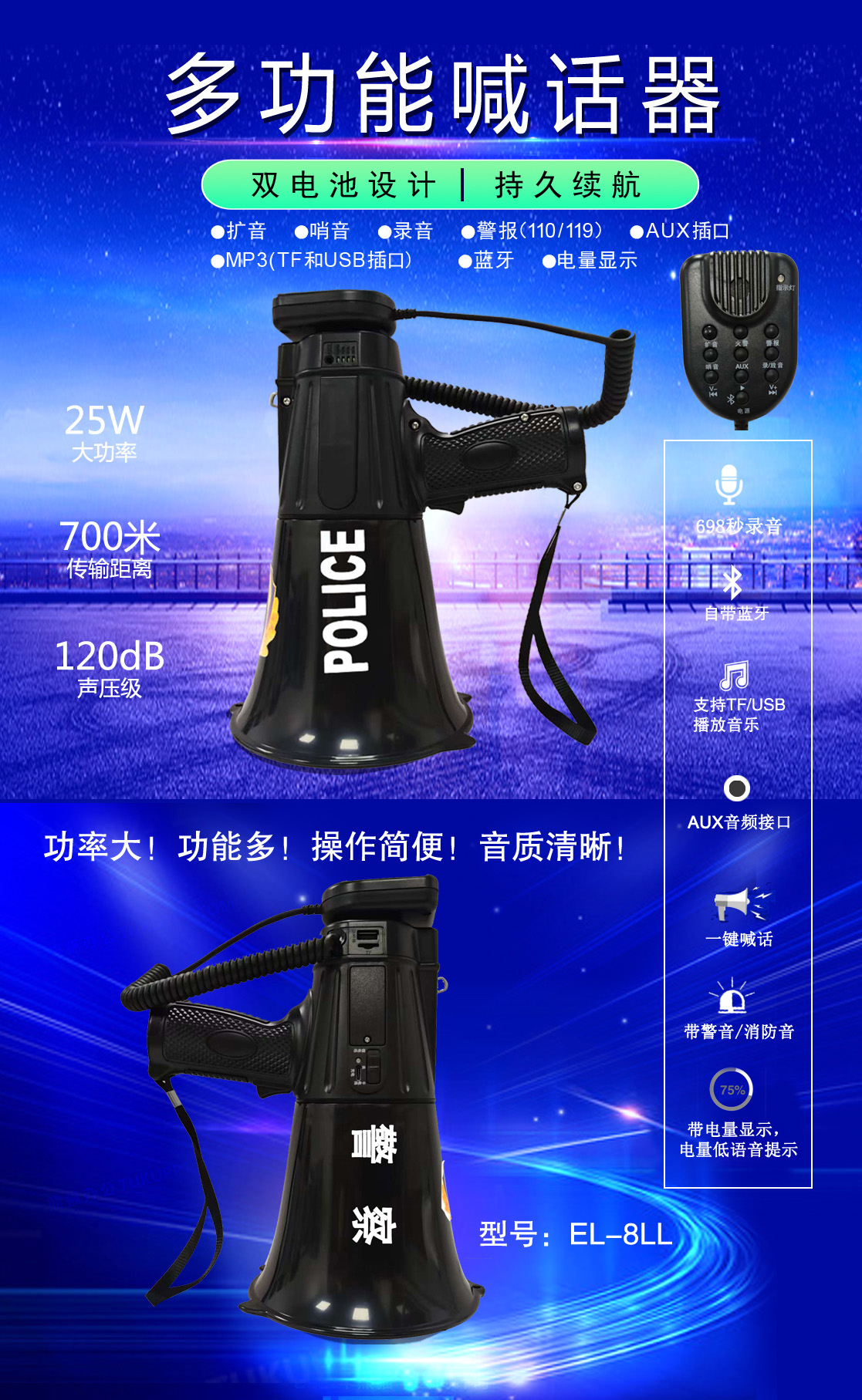 • 專業(yè)設(shè)計,外觀獨特、新穎,操作簡便的多功能喊話器